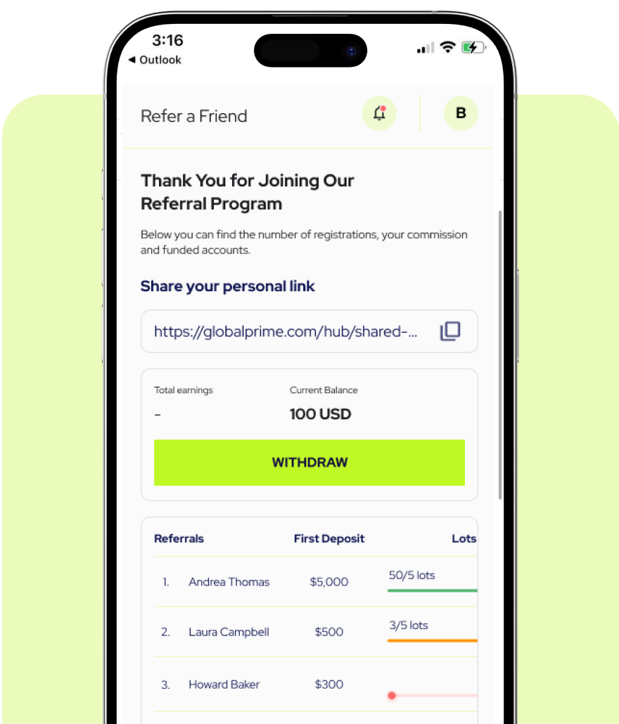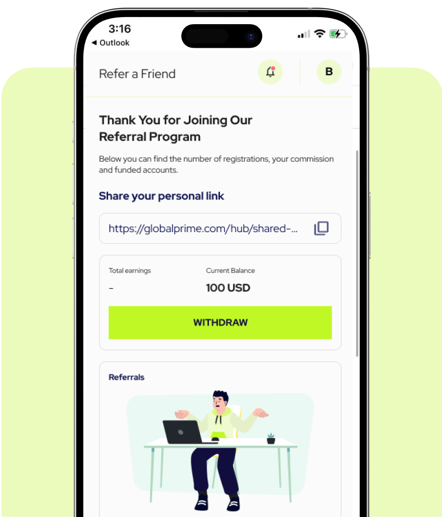 Join Global Prime and copy your unique referral link in the Hub.